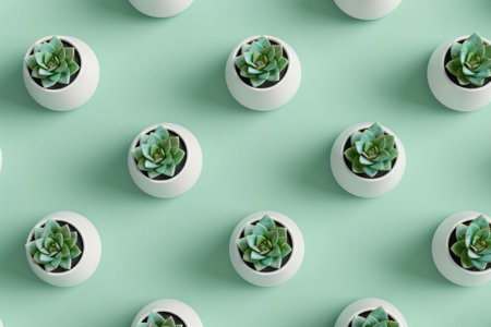 Green succulents in modern white pots on a mint green background, creating a fresh and stylish indoor decor aesthetic Perfect for plant lovers and home decoration enthusiasts