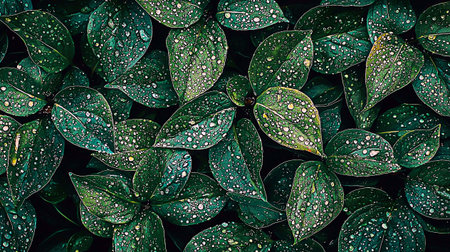A close-up shot of vibrant green leaves, showcasing their detailed vein patterns and glistening water droplets, creating a refreshing natural scene.