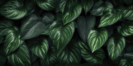 Dark Green Foliage Background. Lush Tropical Plant Leaves, Natural Texture, Abstract Nature Pattern.
