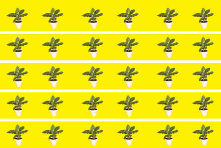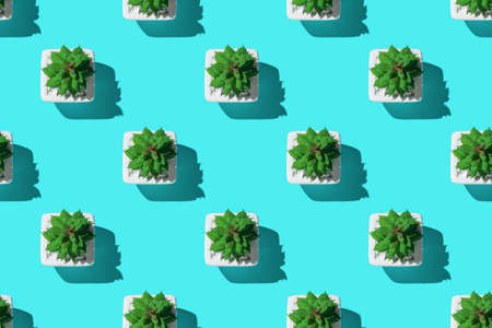 Minimalistic concept of miniature plants. Seamless pattern of succulents in white pots on a blue background. A plant for the desktop.