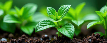 Close-up view of green seedlings emerging from rich, moist soil, showcasing healthy growth and water droplets. A symbol of new beginnings and vitality.