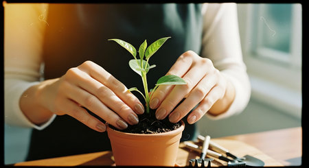 A person carefully holding a small potted plant with green leaves, focusing on nurturing the young plant indoors.