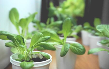 Baby home-grown giant caesar lettuce in white plastic cups with visible soil, in an indoors greenhouse with wooden floor and more blurred larger lettuces in the background.