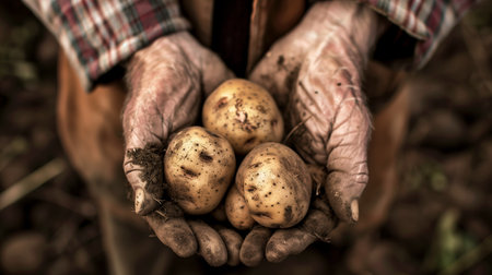 A pair of hands cradling a group of freshly harvested potatoes, still speckled with soil. Generated by artificial intelligence.