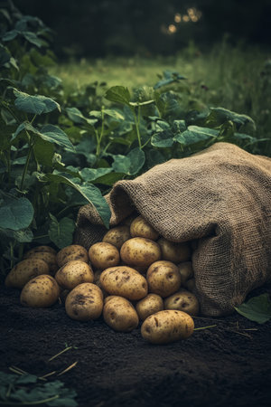 Potatoes are spread out from a burlap sack onto dark soil in a farm field. Lush green plants surround the sack, indicating a rich harvest during late afternoon light.