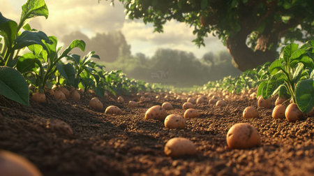 This image captures a field of freshly harvested potatoes nestled in rich soil under soft golden hour light, surrounded by vibrant green leaves, portraying the essence of agricultural life.