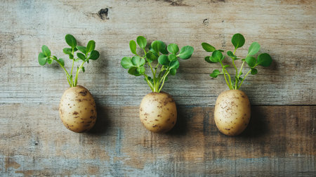 Three sprouting potatoes on wooden surface, agricultural concept