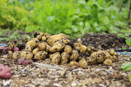 View of just gathered organic potatoes on the ground