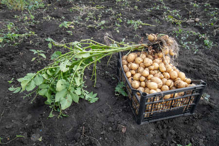 Harvest of young potatoes. Potatoes in a plastic box, standing on the ground. outdoor, summer season
