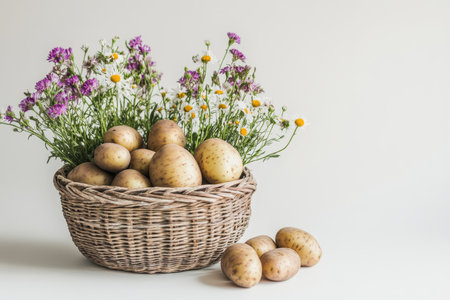 Rustic basket of freshly harvested raw potatoes surrounded by flowers on white background