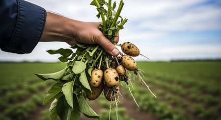 A Hands holding a bunch of fresh potatoes with a farm field in the background, harvest time.