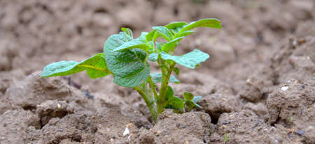 Sprout close-up. Soil with a young plant. Planting potato seedlings in the ground. The concept of nature conservation and agriculture.