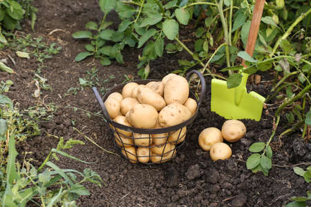 Basket with raw gathered potatoes in the field