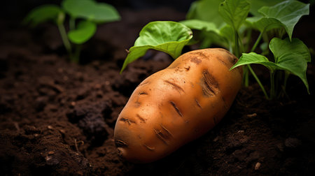 Freshly Harvested Potato Nestled in Earthy Soil with Vibrant Greenery