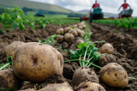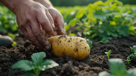Hands dig into rich soil, unearthing a bounty of golden potatoes amidst vibrant green leaves. The autumn sun kisses the earth, making the harvest feel rewarding and nourishing.