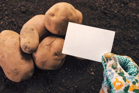 Organic potato farmer holding blank business card mock up above freshly harvested pile of tubers