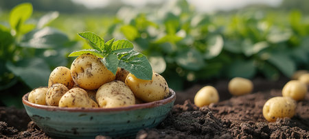 Fresh organic potatoes are shown growing in the field, ready for harvest
