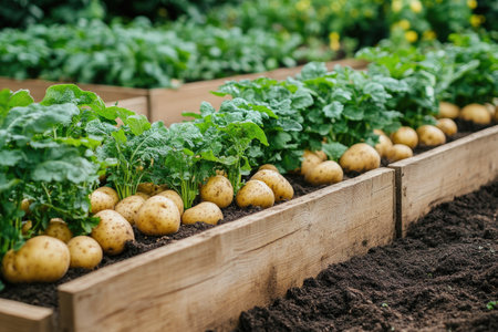 Rows of potato plants thriving in raised garden beds, showcasing healthy growth and abundant harvest potential