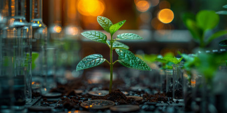 Young plant growing in a soil surrounded by test tubes in a laboratory setting.