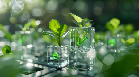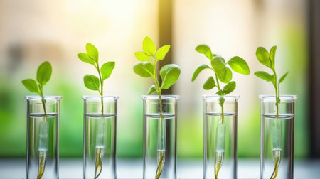 A captivating scene of green plant seedlings thriving in transparent test tubes, representing the intersection of nature and scientific research for a sustainable future.