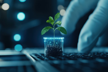 A scientist in blue gloves carefully holds a test tube containing a vibrant green seedling, symbolizing hope for sustainable practices and innovative research in ecology.