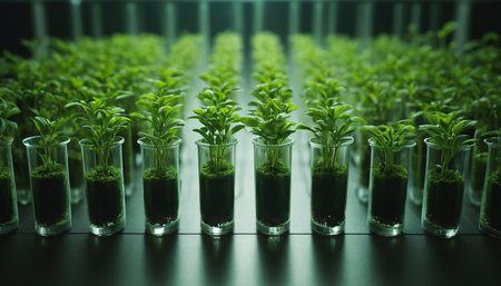 A futuristic laboratory scene showcasing young plants growing in transparent test tubes, highlighting advancements in biotechnology and sustainable practices.