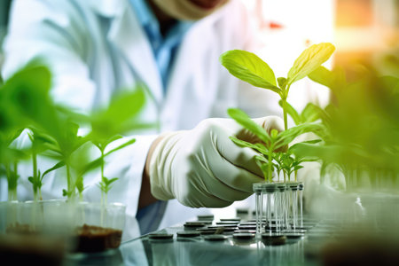 A scientist conducts precise analysis of young plants in a clean laboratory setting, using a dropper to support growth and study important botanical factors.