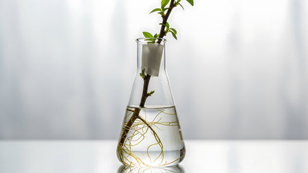 A young plant with roots growing inside a glass test tube, symbolizing scientific research and innovation in plant biology and sustainable development.