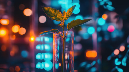 A serene green plant stands in a glass tube surrounded by colorful bokeh lights, representing growth and a connection to nature in an urban setting. Perfect for environmental themes.