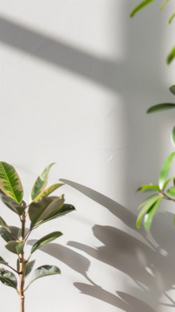 Sunlight illuminates a green plant with round leaves, creating beautiful shadows on a white wall in the morning.