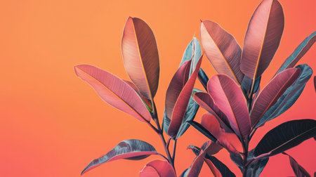 Close-up of rubber plant leaves in pink and green hues, contrasting against a bold orange background, offering a modern botanical aesthetic.