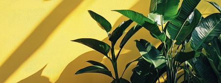 Tropical plant leaves isolated on yellow background, vertical shot with copy space