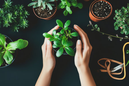 Hands Gently Holding a Vibrant Houseplant - Top View for Gardening, Nature Themes