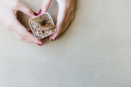 Flat lay of female hand holding a small catus on the clean vintage canvas.