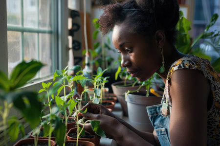 Focused African American woman tending to young plants in sunlit room, nurturing growth AI