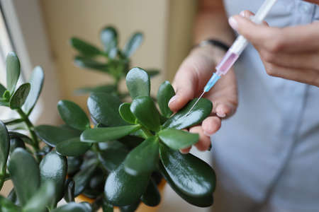 Syringe is injected into stem of the plant. Domestic flower diseases and their treatment concept