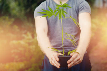 Young of medical researcher holds a cannabis seedling on pot in the garden.