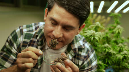 Marijuana farmer tests marijuana buds in curative marijuana farm before harvesting to produce marijuana products
