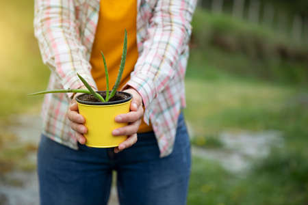 unrecognizable woman holding a pot with an aloe vera plant and copy space. countryside