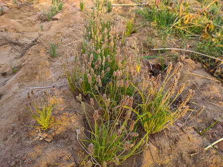 Lanceolata or ribworth plantain herb in bloom in the meadow. Close-up of Plantago lanceolata on summer