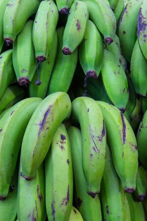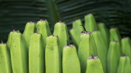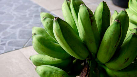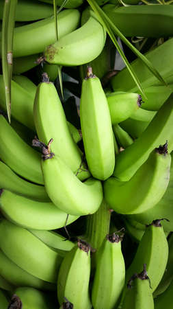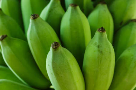 Close up view of young unripe green of Saba banana or Pisang Nipah. Fruit food local fresh good for consume daily. It is a triploid hybrid banana cultivar originating from the Philippines.