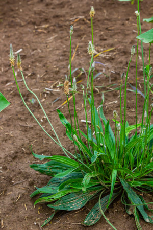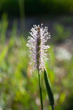 Ribwort plantain Plantago lanceolata. Medicinal plants in the garden.