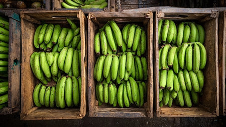 Green bananas are abundant and fresh from harvest, filling rustic wooden crates at an outdoor market, representing agricultural produce and healthy eating