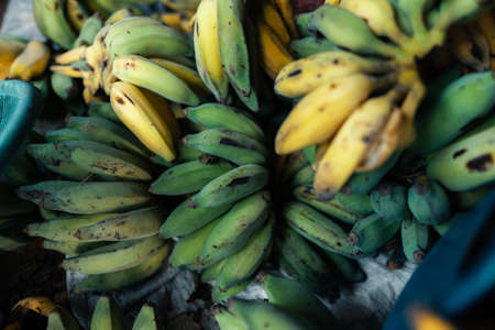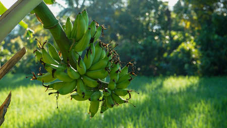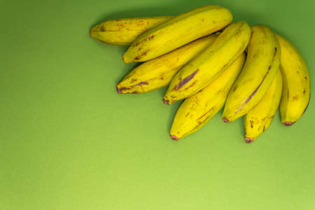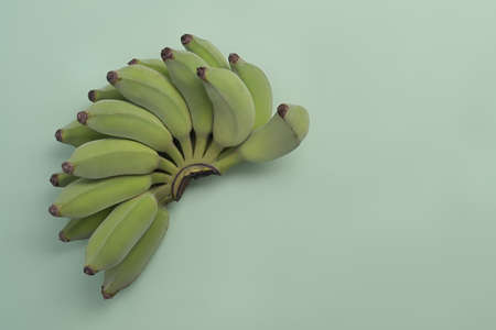 Bunch of Asian bananas or cultivated bananas on green background with copy space.
