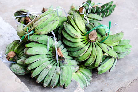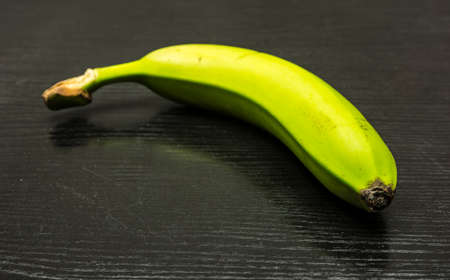 Raw and green cultivated banana put on the black floor. it is a long curved fruit that grows in clusters and has soft pulpy flesh and yellow skin when ripe.