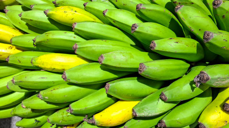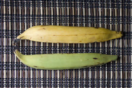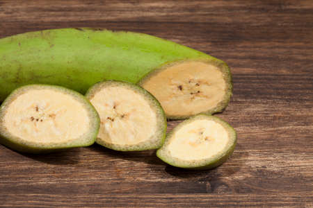 Ripe nigerian plantain on wood kitchen table surface