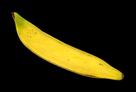 A single ripening plantain banana against a black background.