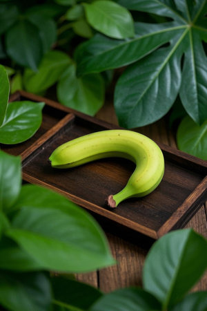 Bananas and green leaves on a wooden plate