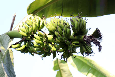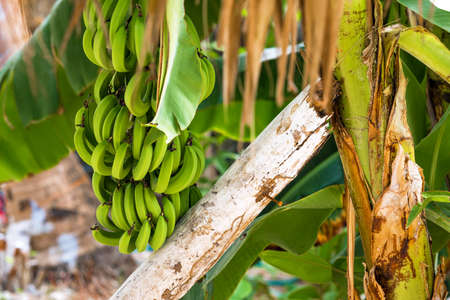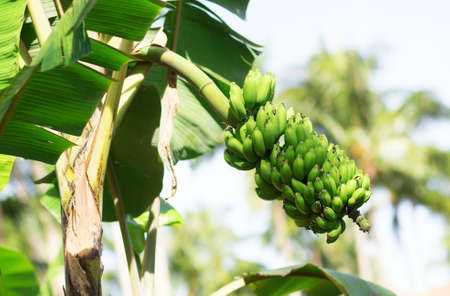 healthy raw banana bunch on tree in firm