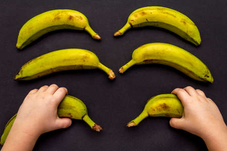 Several ripe yellow-green bananas on a children hands. Black background, close up, top view.